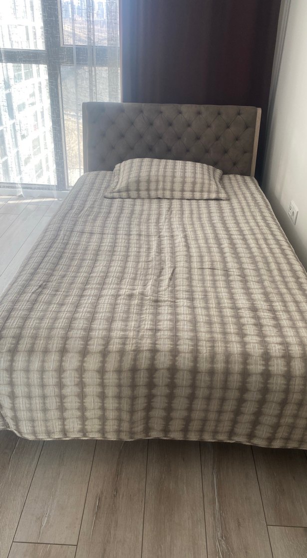 Gri ekose desenli yatak örtüsü, uyumlu yastık kılıfı ile birlikte şık ve sade bir görünüm sunar.Çok iyi durumda 1,-1,5 kişilik yatak ebatlarına uygun