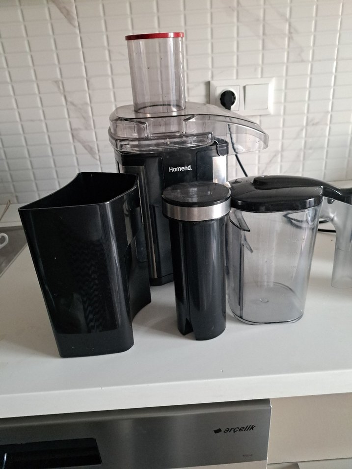 Homend katı meyve sıkacağı siyah ve gri renkte, çıkarılabilir parçalarla kolay temizlenir. Posalık ve meyve suyu kabı dahildir.