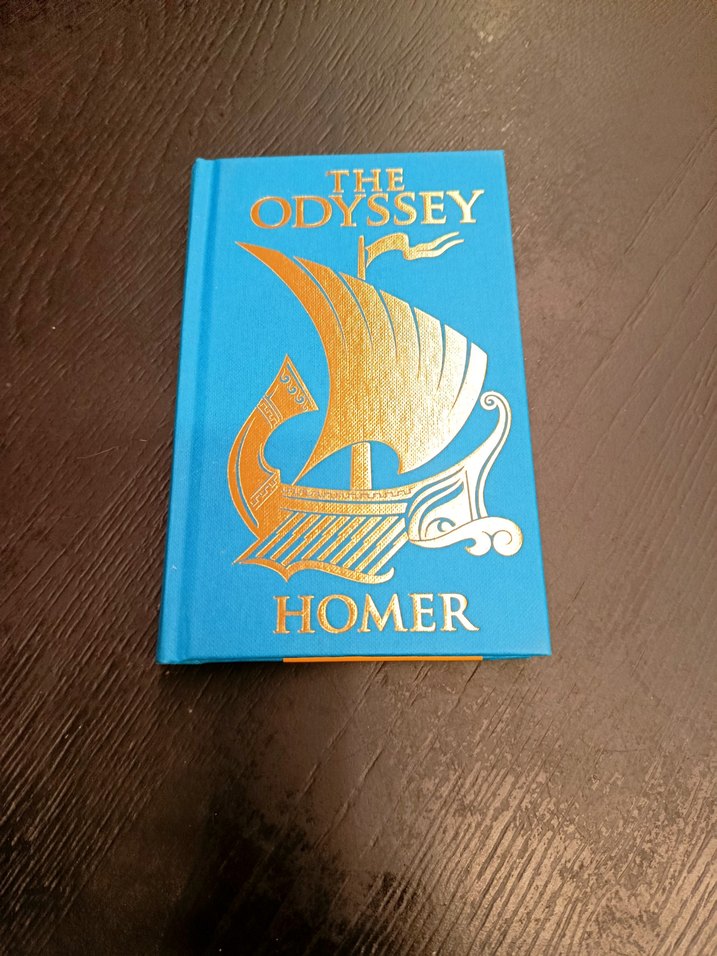Mavi kapaklı Homer'in Odyssey kitabı, altın varaklı gemi illüstrasyonu ve yazısıyla klasik Yunan mitolojisi eserini sunar.