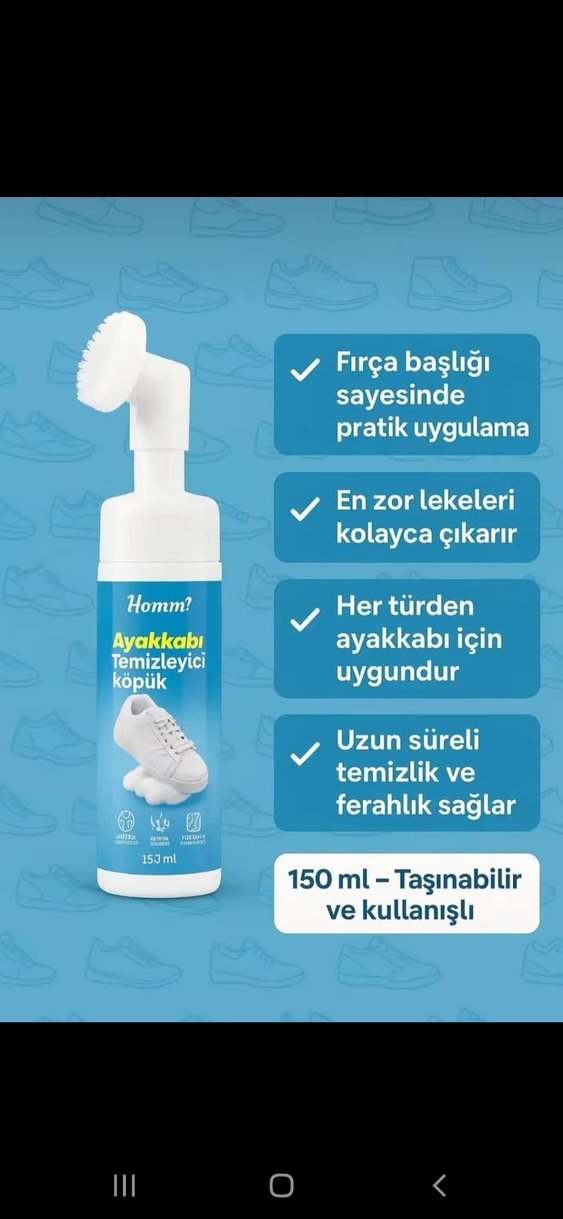 Homm? ayakkabı temizleyici köpük, fırça başlığı sayesinde pratik uygulama sağlar. En zor lekeleri kolayca çıkarır, her tür ayakkabı için uygundur. 150 ml taşınabilir ve kullanışlıdır.