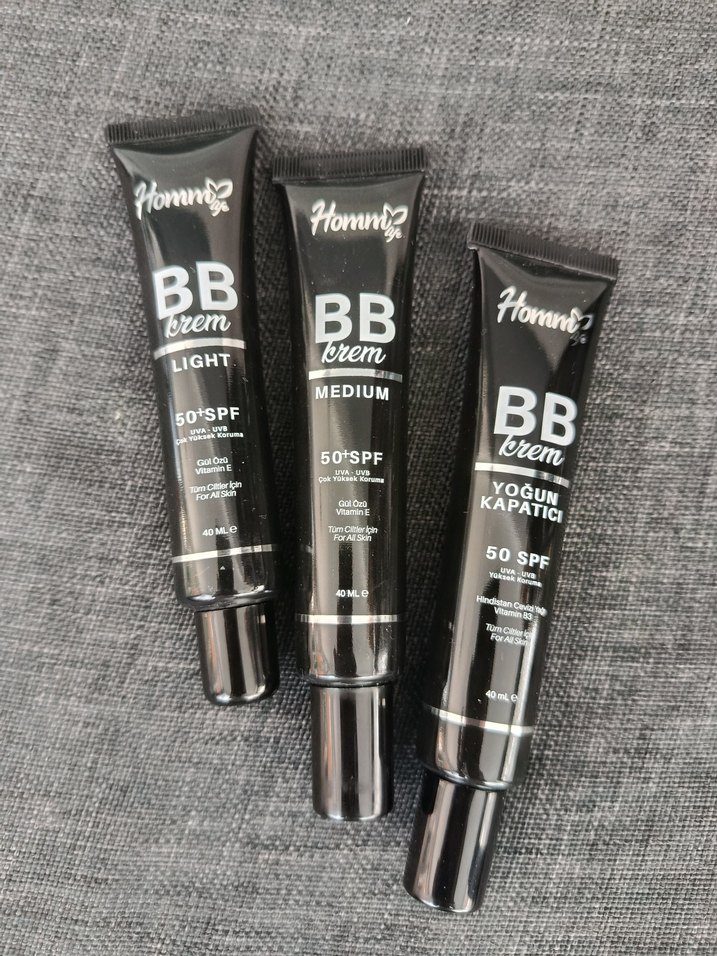 Homm BB Krem, açık, orta ve yoğun kapatıcılık seçenekleriyle 50+ SPF koruma sağlar. Her tüp 40 ml'dir.