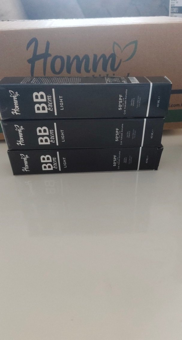 Homm BB Krem Light siyah ambalajda, SPF 60 koruması ile 40 ml tüplerde sunulur. Açık ton kapatma sağlar, koyu renk seçeneği mevcuttur.