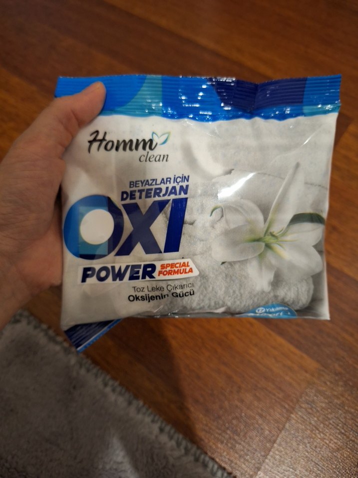 Homm Oxi Power toz deterjan, oksijen gücü ve özel formülü ile beyazlardaki lekeleri etkili şekilde çıkarır. Skt:09.28