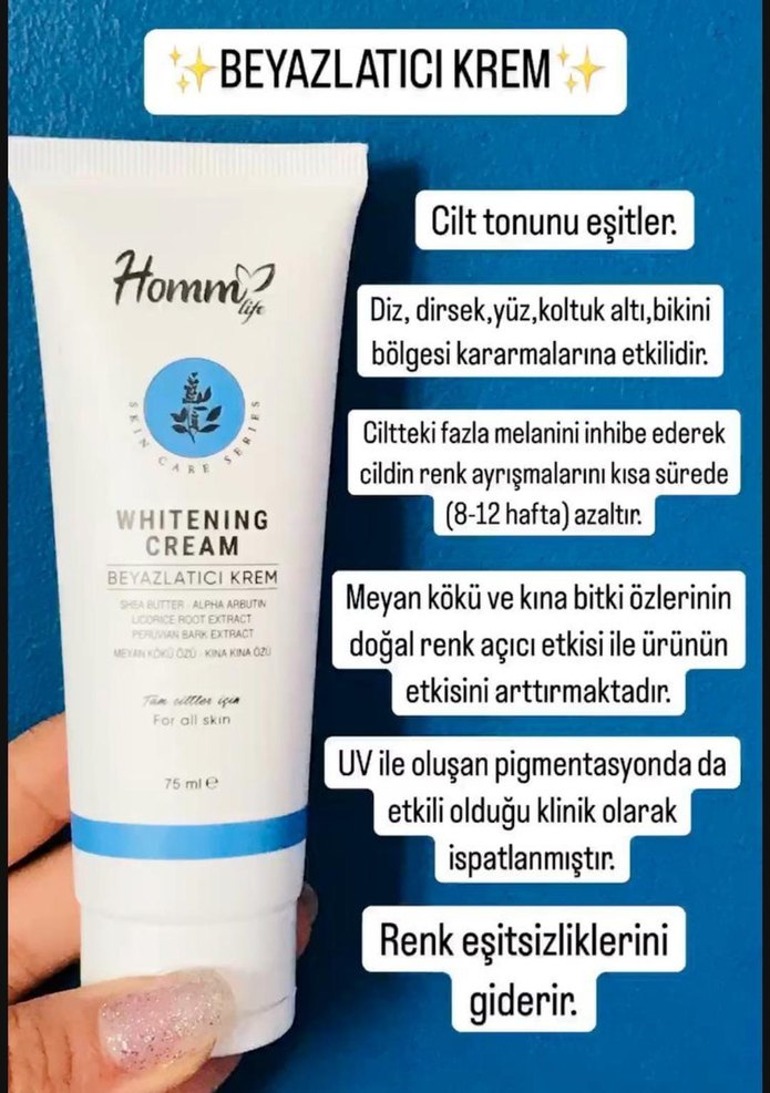 Homm beyazlatıcı krem cilt tonunu eşitler, diz, dirsek, yüz, koltuk altı ve bikini bölgesi kararmalarını azaltır. Meyan kökü ve kına özleriyle doğal renk açıcı etkisi vardır, UV kaynaklı pigmentasyona karşı klinik olarak etkilidir.