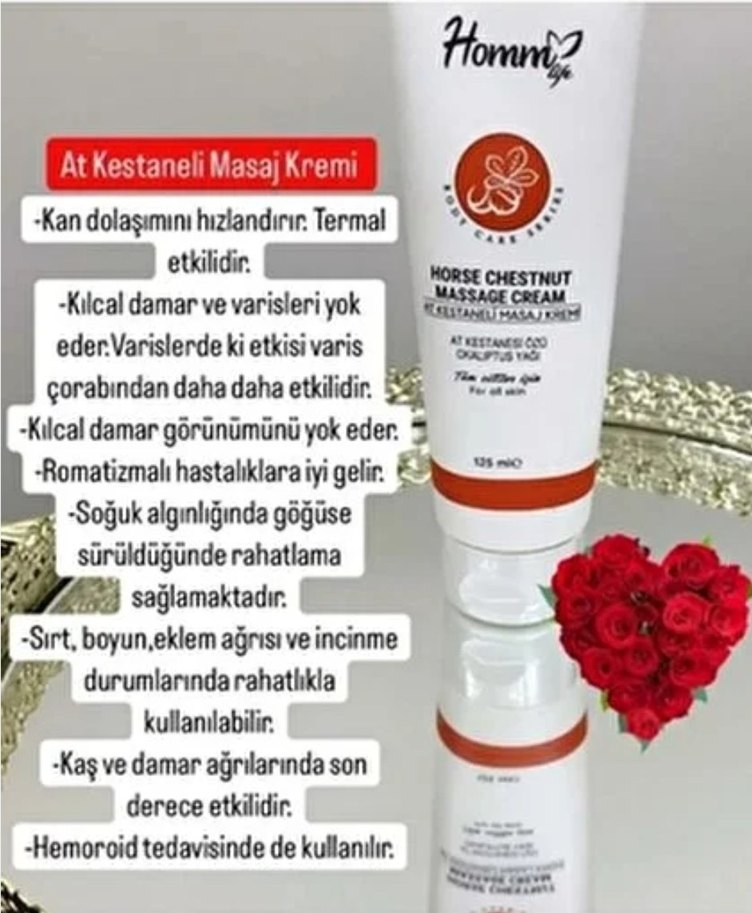At kestanesi masaj kremi kan dolaşımını hızlandırır, kas ve eklem ağrılarında rahatlama sağlar. Varis, soğuk algınlığı ve hemoroid tedavisinde etkilidir.