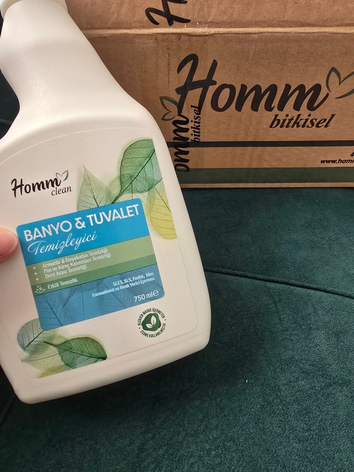 Homm bitkisel banyo ve tuvalet temizleyici, ferah kokulu ve etkili temizlik sağlar. 750 ml şişede sunulmuştur.