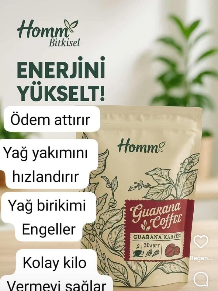 Homm bitkisel Guarana Kahvesi, enerjinizi yükseltir, ödemi attırır, yağ yakımını hızlandırır ve yağ birikimini engeller. Kolay kilo vermeyi destekler. ☕