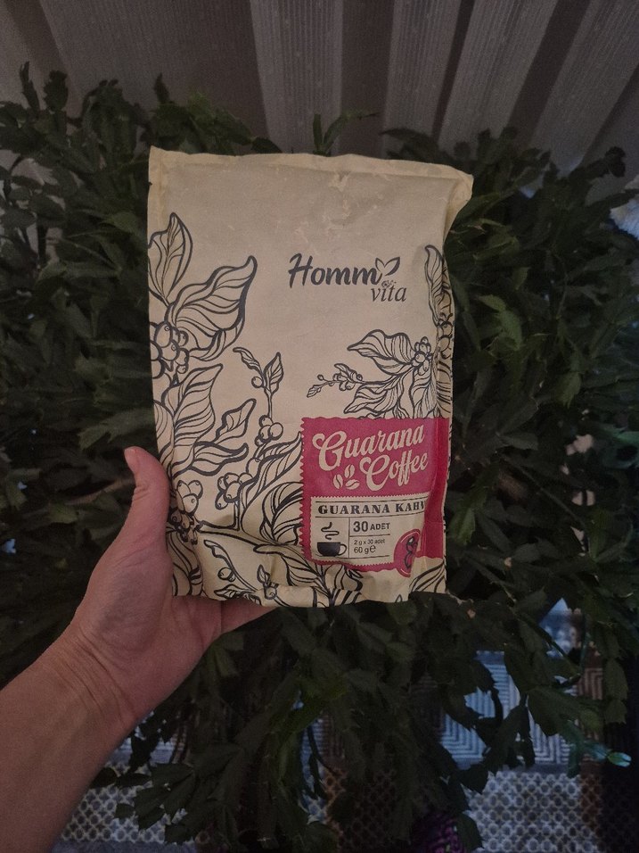 Homm bitkiselGuarana Kahvesi, pastel bordo renkte paket içinde, 30 adet kahve içerir. ☕