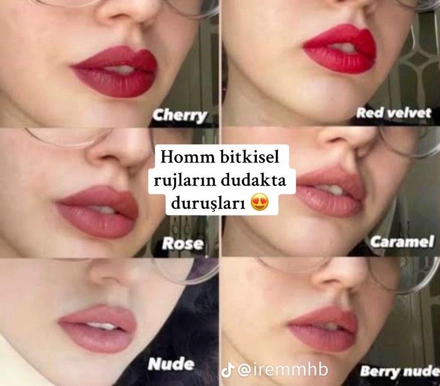 Homm bitkisel kırmızı parlak ruj, dudakta Cherry, Rose ve Nude tonlarını sunar.