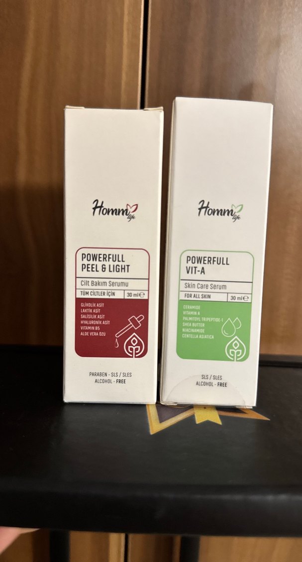 Homm cilt bakım serumu seti, laktik asit ve B5 vitamini içeren güçlü peel ve hafif formül ile seramid ve centella asiatica içeren vitamin A serumu içerir. Her ikisi de alkolsüz ve tüm cilt tiplerine uygun. Kırmızı peeling ve Retinol set