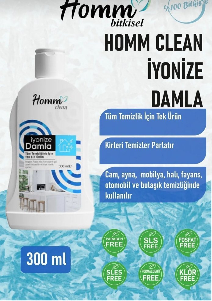 Homm Clean iyonize damla bitkisel temizlik ürünü kirleri temizler ve parlatır. Cam, ayna, mobilya, halı, fayans, otomobil ve bulaşık temizliğinde kullanılır. Paraben, SLS, fosfat, formaldehit, SLES ve klor içermez.