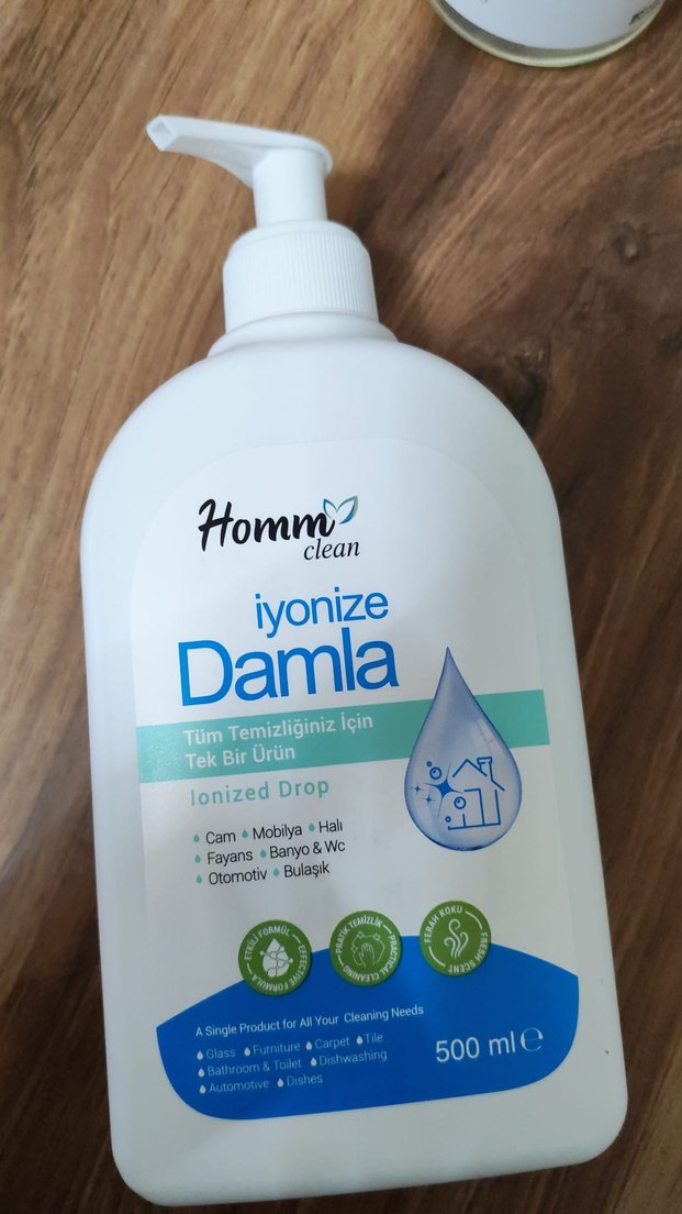Homm Clean İyonize Damla, cam, mobilya, halı, fayans, banyo, otomotiv ve bulaşık için uygun 500 ml pompalı temizlik sıvısıdır.