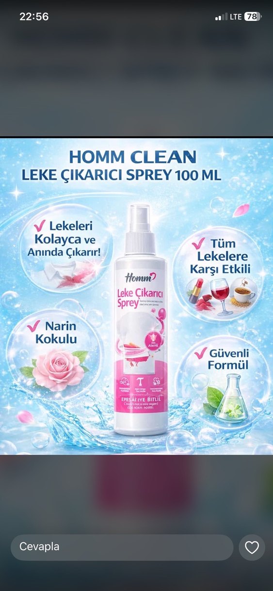 Homm Clean leke çıkarıcı sprey, narin gül kokusuyla lekeleri kolayca ve anında çıkarır. Tüm lekelere karşı etkili ve güvenli formüle sahiptir.