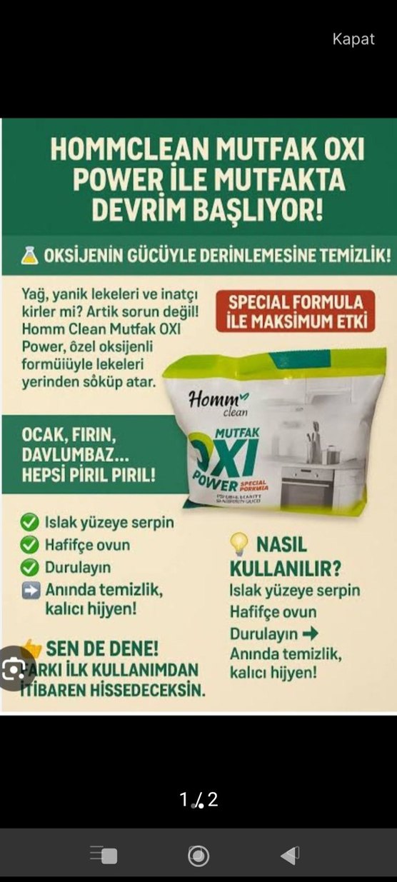 Homm Clean Mutfak Oxi Power, oksijen gücüyle yağ, yanık ve inatçı kirleri derinlemesine temizler. Islak yüzeye serpip hafifçe ovalayın, durulayın, anında temizlik ve kalıcı hijyen sağlar.