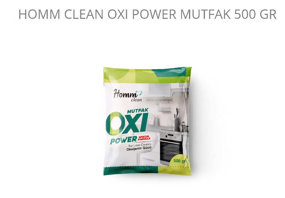 Homm Clean Mutfak Oxi Power toz, oksijenin gücüyle mutfak yüzeylerini temizler. 500g parlak haki renkte ambalajda sunulmuştur. sicak su ile etkisi ortaya cikar