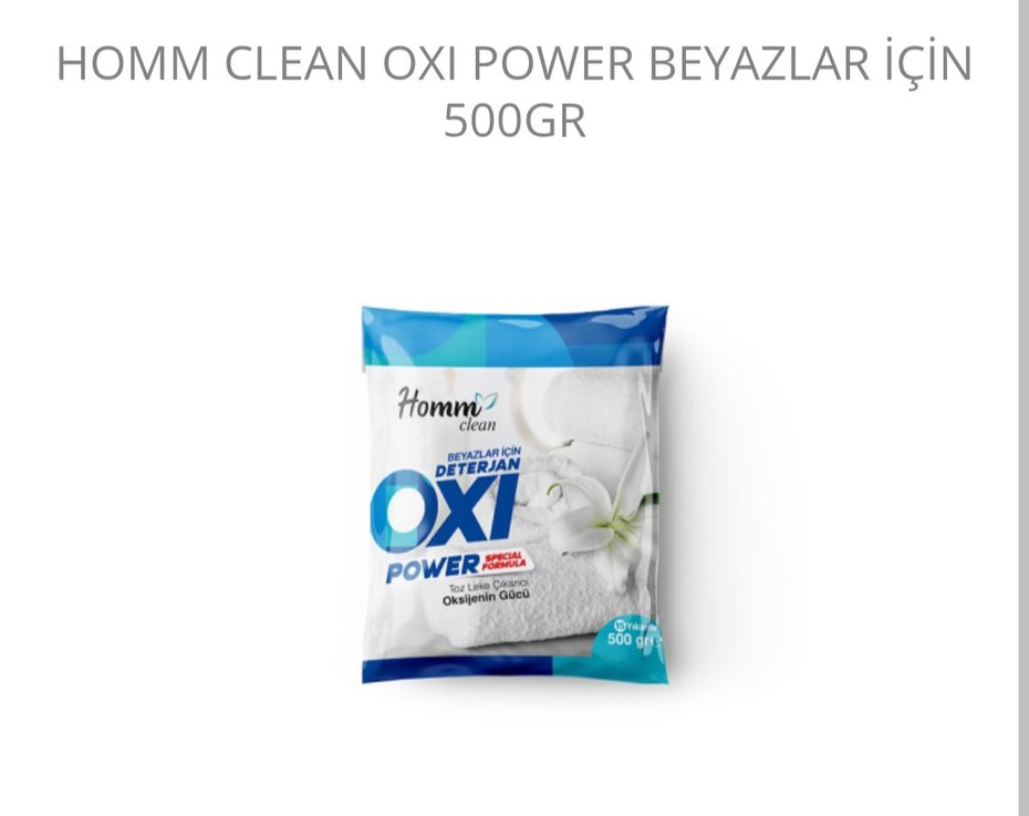 Homm Clean Oxi Power beyaz toz deterjan, güçlü oksijen etkisiyle etkili temizlik sağlar. 500 gramlık paketi beyazlar için uygundur.