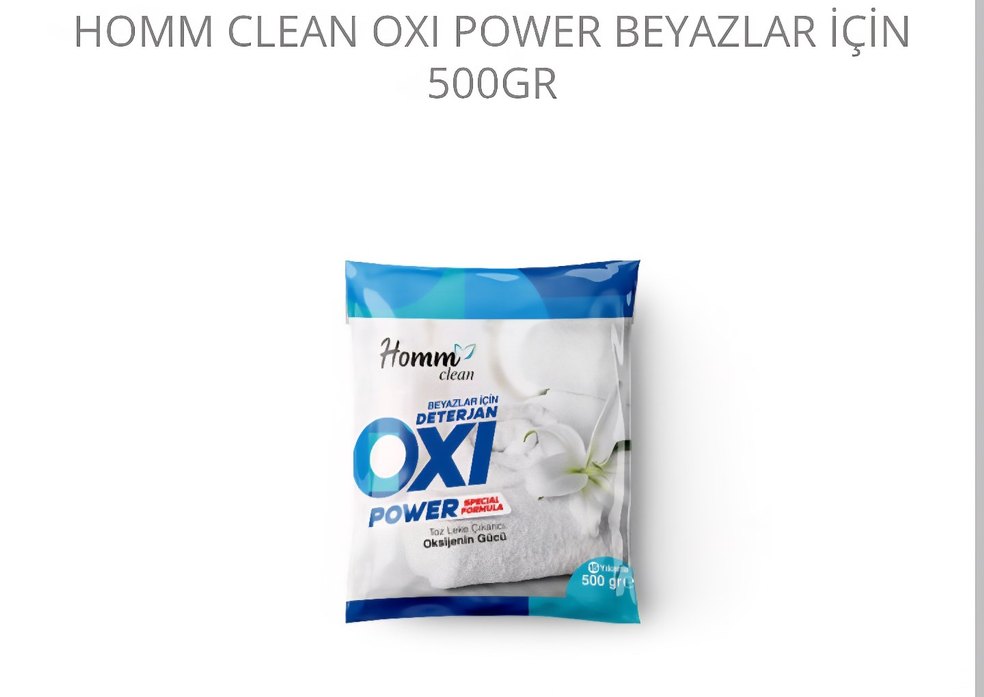 Homm Clean Oxi Power beyaz toz deterjan, güçlü oksijen etkisiyle etkili temizlik sağlar. 500 gramlık paketle sunulur. sicak su ile etkisini gösterir