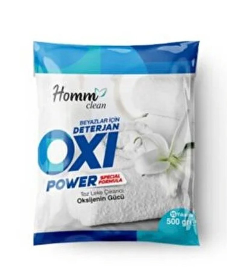 Homm Clean Oxi Power beyazlar için deterjan tozu, zorlu lekeleri çıkarmak için güçlü oksijen gücü sunar. 500g paket, parlak beyaz renktedir.