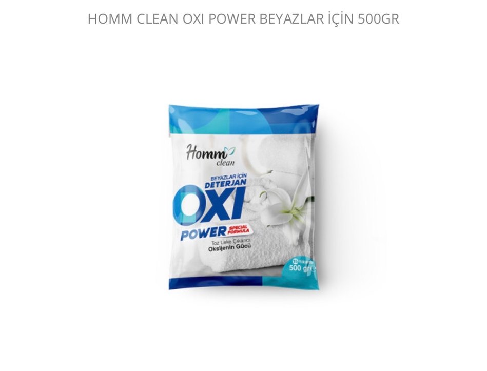 Homm Clean Oxi Power, beyazlar için özel toz deterjan olup, leke çıkarıcı oksijen gücü sunar. 500 gramlık pakette mevcuttur.