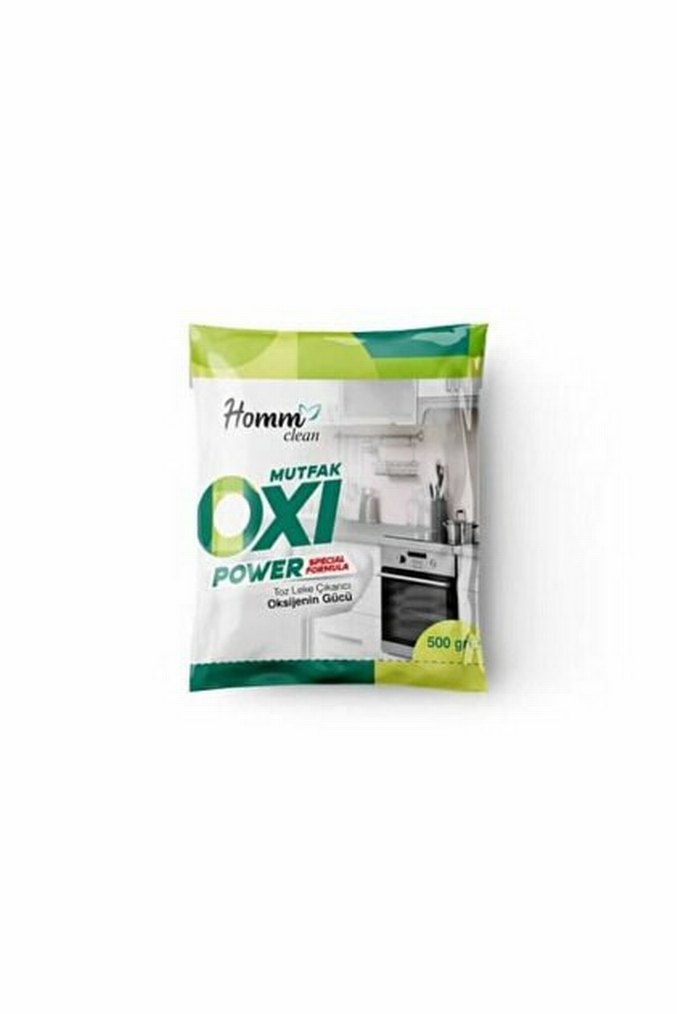 Homm Clean Oxi Power mutfak toz temizleyici, güçlü oksijen gücüyle etkili yağ çözücü. 500 gramlık pakette sunulur.