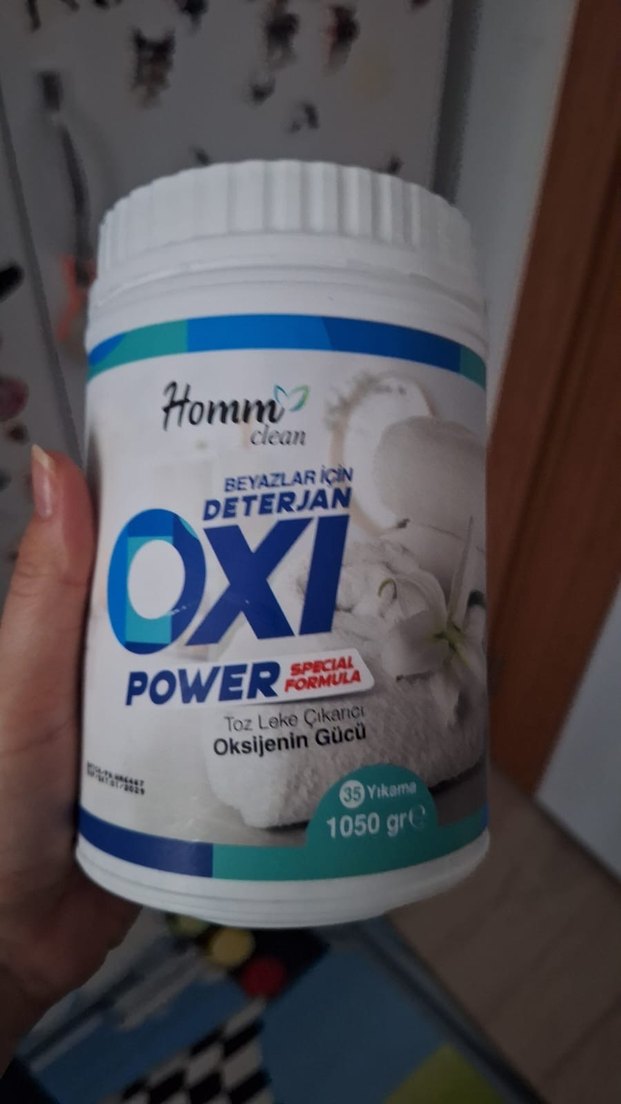 Homm Clean Oxi Power toz deterjan, oksijenin gücüyle leke çıkarır. Beyazlar için uygundur ve 1050 gramlık kutuda 35 yıkama sağlar.