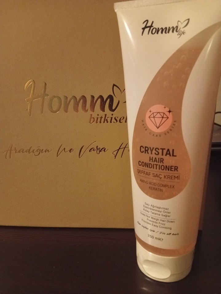 Homm Crystal bitkisel, amino asit ve keratin içeren şeffaf saç kremi, saç dökülmesini azaltır ve saçı yumuşak, parlak tutar. 250 ml.