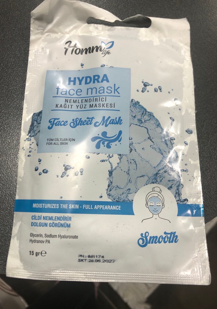 Homm Hydra kağıt yüz maskesi cildi nemlendirir ve pürüzsüzleştirir, dolgun görünüm sağlar. Tüm cilt tipleri için uygundur, gliserin ve sodyum hyaluronat içerir.