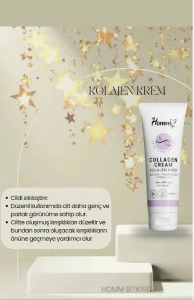 Homm Kollajen Krem, cildi sıkılaştırır, oluşmuş kırışıklıkları düzeltir ve yenilerinin oluşmasını önler. Düzenli kullanımda cilt genç ve parlak görünür. sıfır