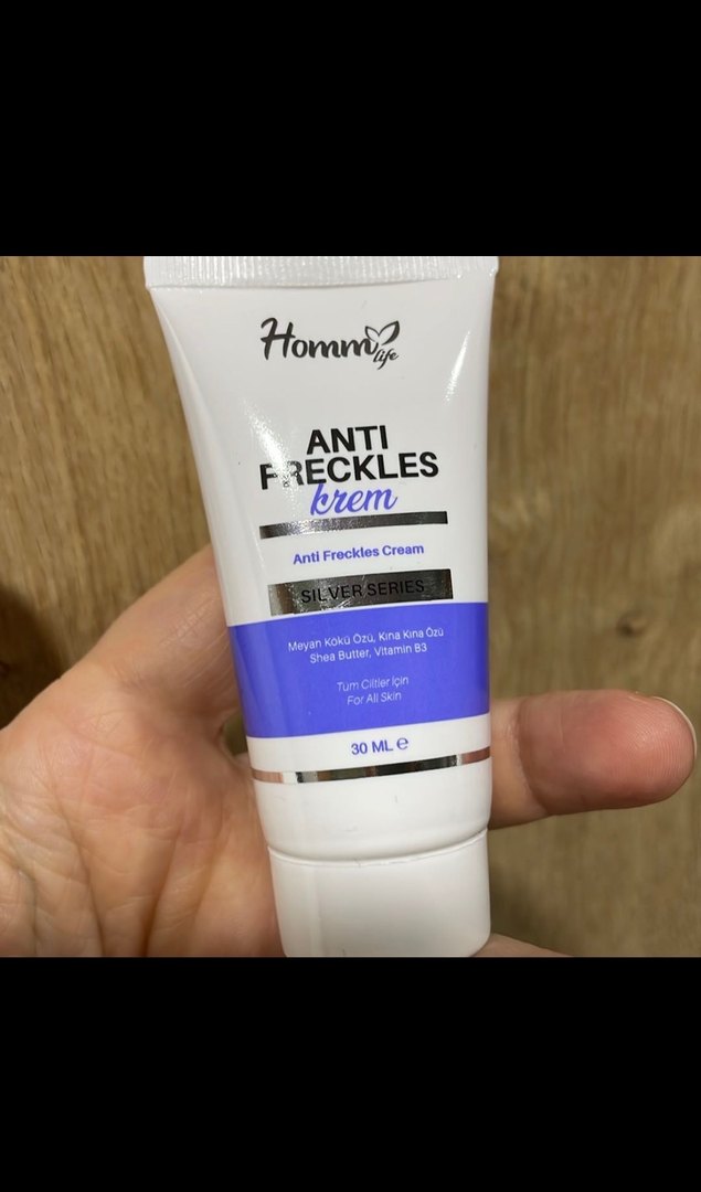 Homm leke karşıtı krem, cildi nemlendirirken çillerin görünümünü azaltır. Shea yağı, vitamin B3 ve doğal yağlar içerir. Tüm cilt tipleri için uygundur.