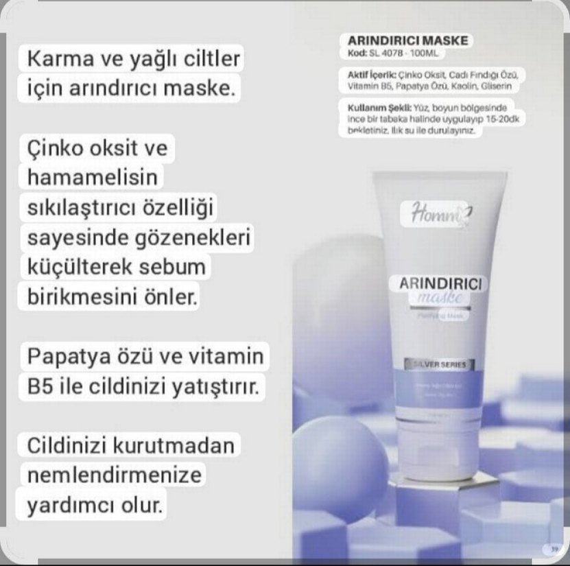Homm Life Arındırıcı Maske, yağlı ve karma ciltler için Silver Serisi'nden 100 ml'lik pratik bir tüpte sunulmaktadır.