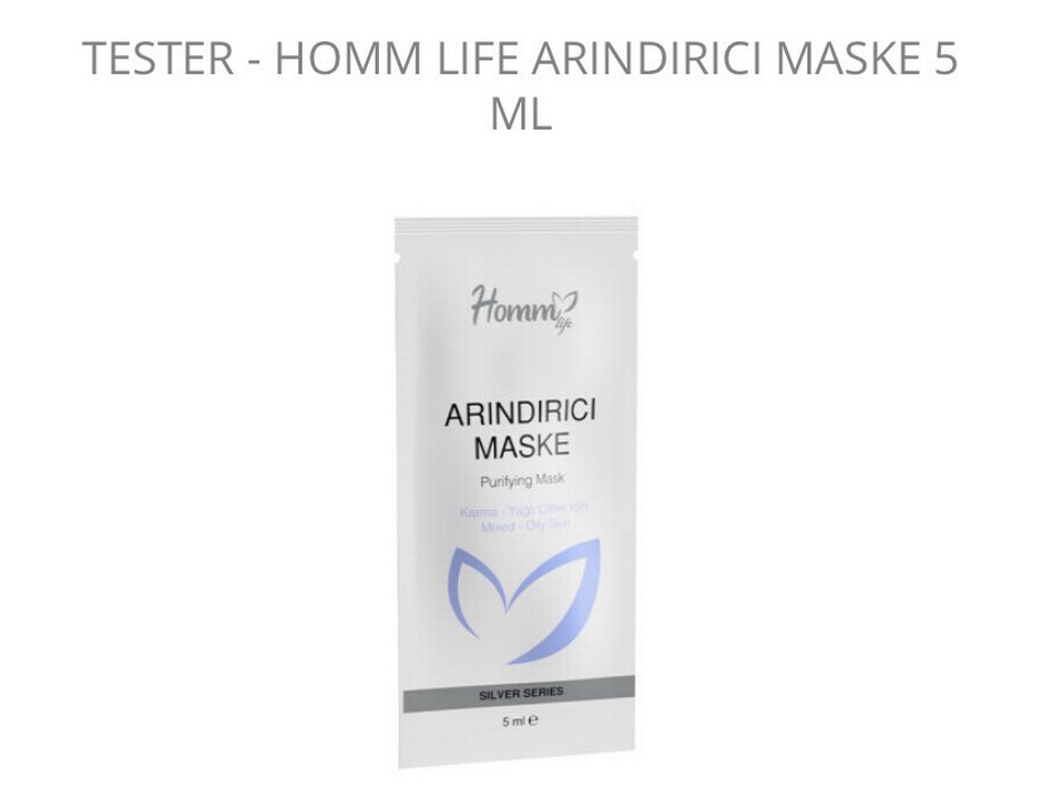 Homm Life arındırıcı maske, karma ve yağlı ciltler için temizleyici ve ferahlatıcı etkiye sahiptir. 5 ml poşet içinde sunulur. NOT: TESTER SİPARİŞLERİNİ 200 tl ve ÜZERİ SİPARİŞLERDE ALIYORUM. SADECE TEK BİR TESTER ÜRÜN GÖNDERİMİ YAPMIYORUM. BİLGİNİZ OLSUN. SADECE TESTER ÜRÜN ALIMI YAPMAK İSTEYENLER EN AZ 6 ADET VE ÜZERİ GÖNDERİM SAĞLAYABİLİRİM. ANLAYIŞINIZ İÇİN TEŞEKKÜR EDER KEYİFLİ ALIŞVERİŞLER DİLERİM.