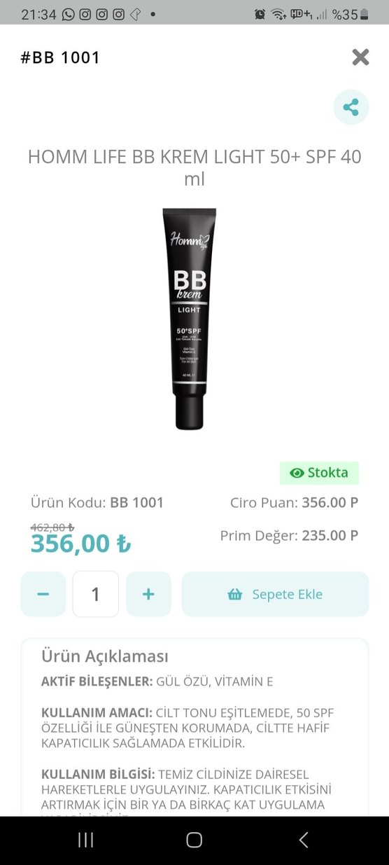 Homm Life BB Krem light tonunda, SPF 50+ koruma sağlar. Gül özü ve vitamin E içerir, cilde bakım yapar.