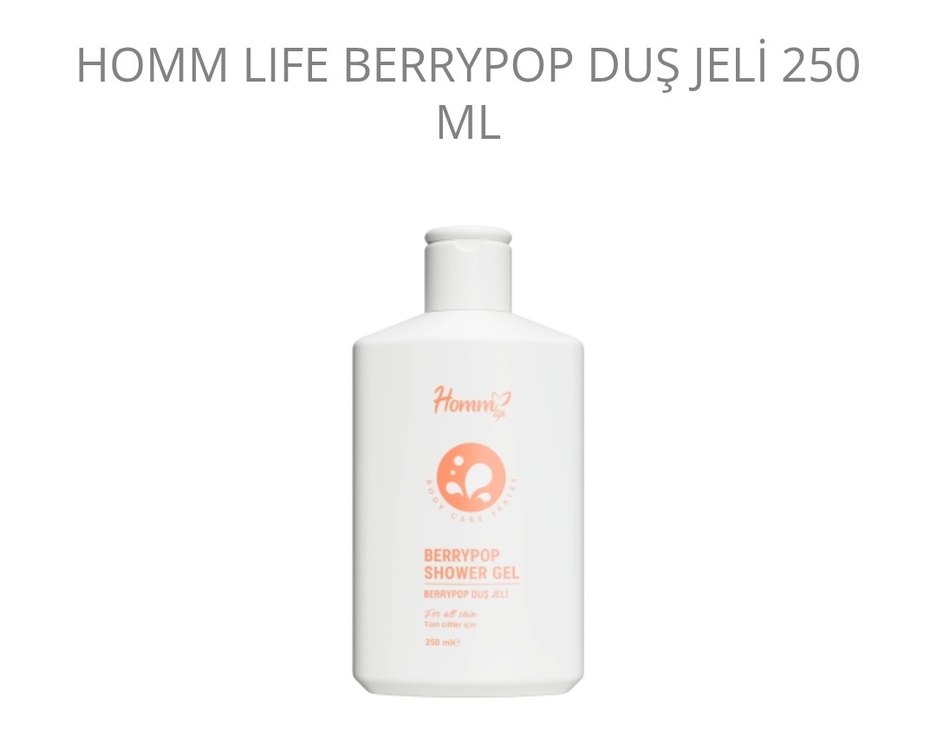 Homm Life Berrypop duş jeli, tüm cilt tipleri için uygun, ferahlatıcı meyve kokulu ve nazik formüle sahiptir. 250 ml şişede sunulur.