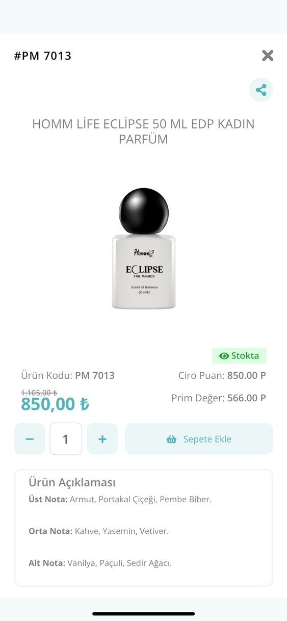 Homm Life Eclipse kadın parfümü, armut, portakal çiçeği ve pembe biber üst notalarına sahiptir. 50 ml şişede sunulur.