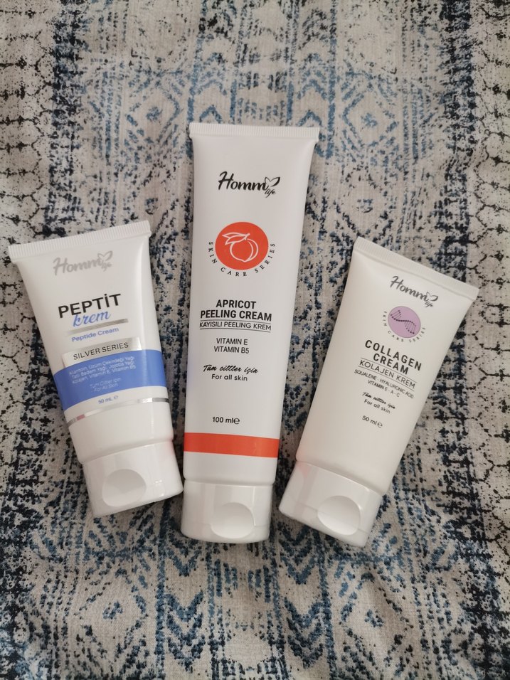 Homm life el kremi seti; peptit serisi, vitaminli kayısı peeling kremi ve kolajen kremi içerir. Cilt bakımı ve nemlendirme sağlar.