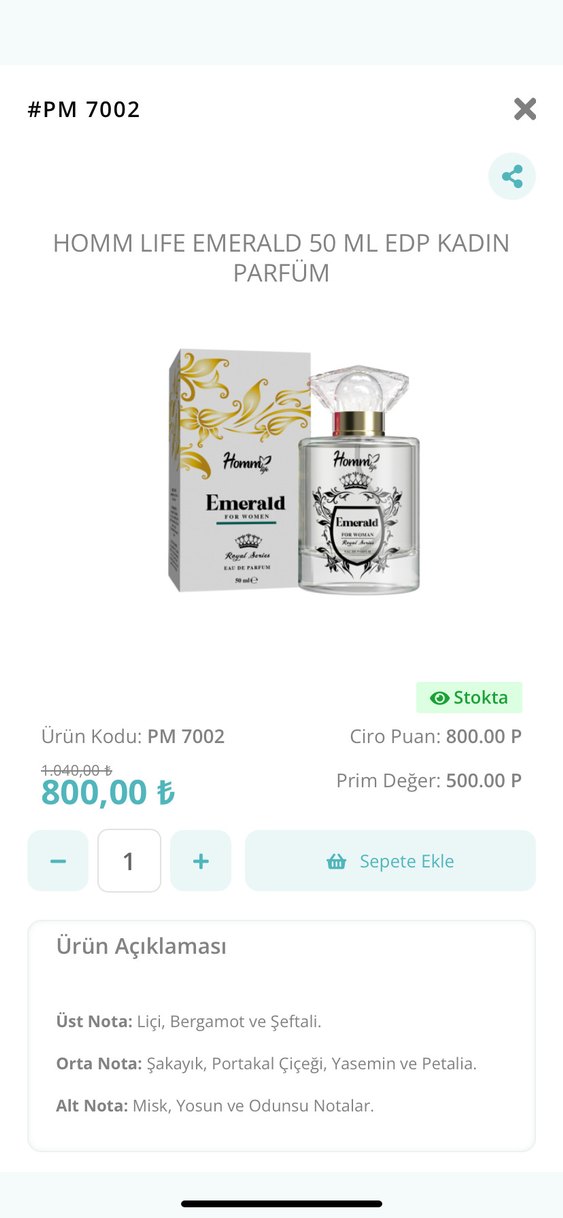 Homm Life Emerald, kadınlar için 50 ml Eau de Parfum şişesinde sunulan zarif bir parfümdür. Şık şişe tasarımı, lüks kokusunu tamamlar.