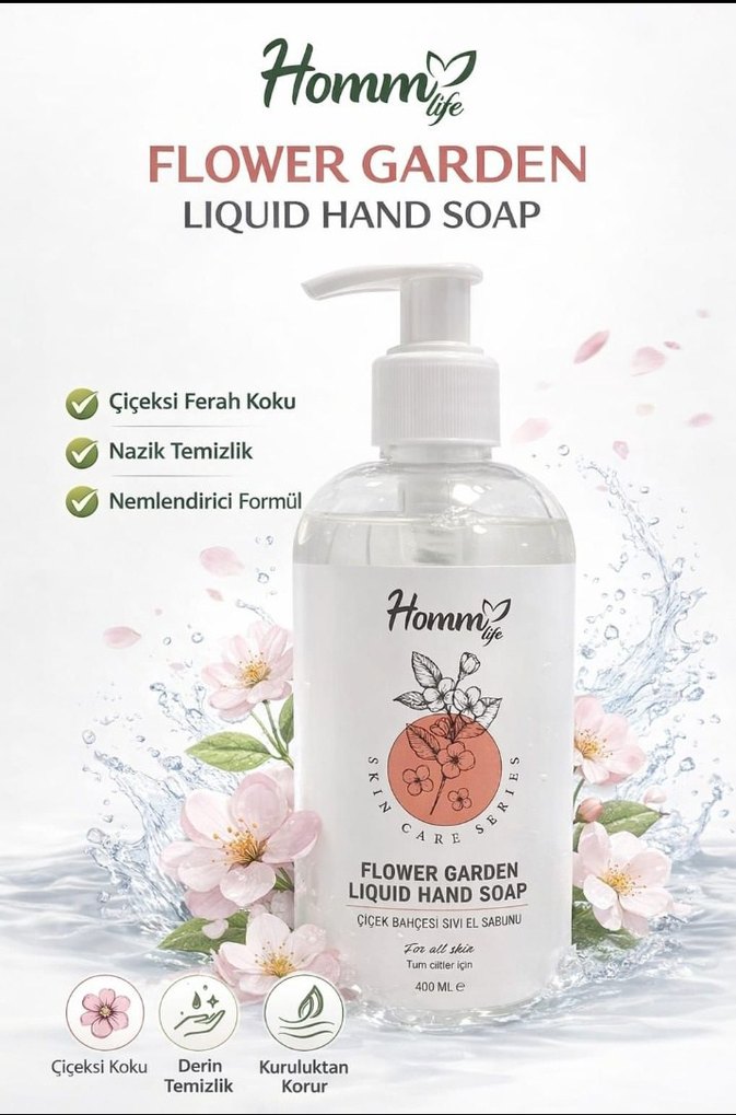 Homm Life Flower Garden sıvı el sabunu, çiçeksi ferah koku ve nemlendirici formülü ile nazik temizlik sağlar. 400 ml pompalı şişede.