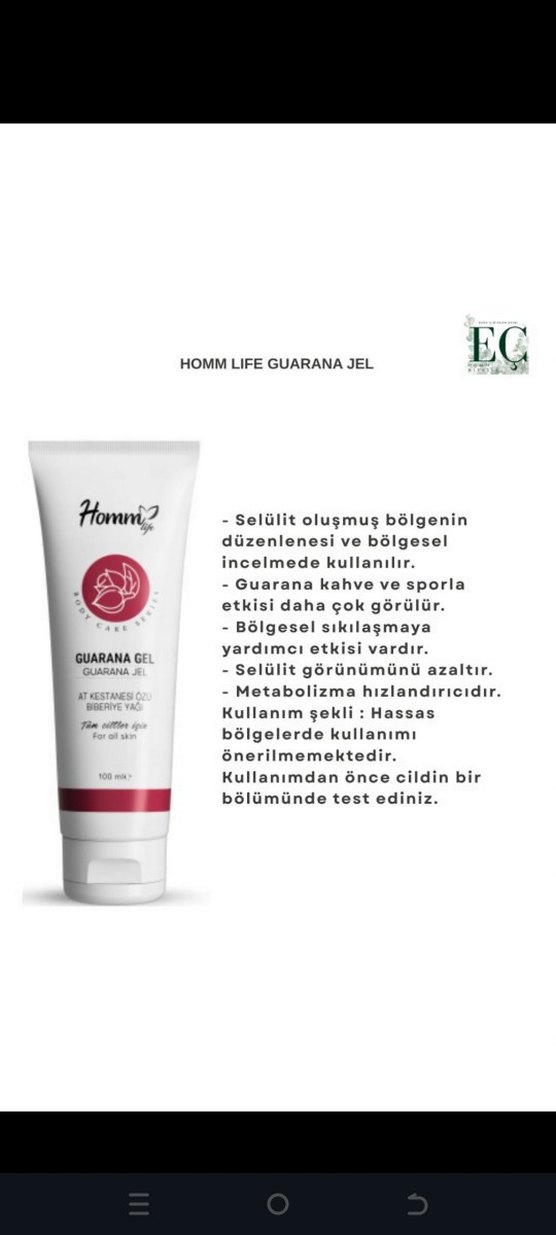 Homm Life Guarana Jel, selülit görünümünü azaltır ve bölgesel sıkılaşmaya yardımcı olur. Metabolizmayı hızlandırır, hassas bölgelerde kullanımı önerilir. Kullanımdan önce cilt testi yapınız.