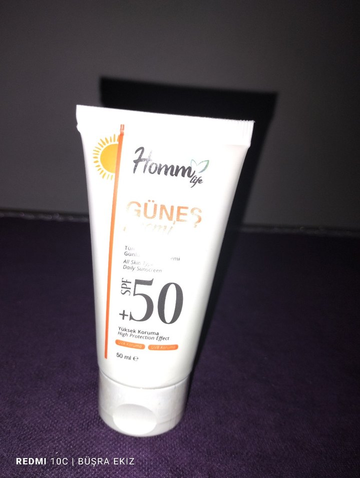 Homm Life güneş kremi SPF 50 ile yüksek koruma sağlar. Tüm cilt tipleri için uygundur. 50 ml tüp şeklindedir. ☀️