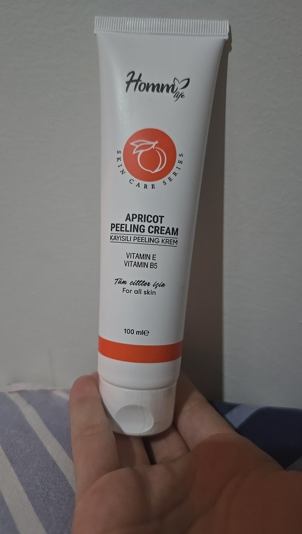 Homm Life Kayısılı Peeling Krem, Vitamin E ve B5 ile tüm cilt tipleri için nazikçe peeling yapar ve bakım sağlar. 100 ml tüpte.