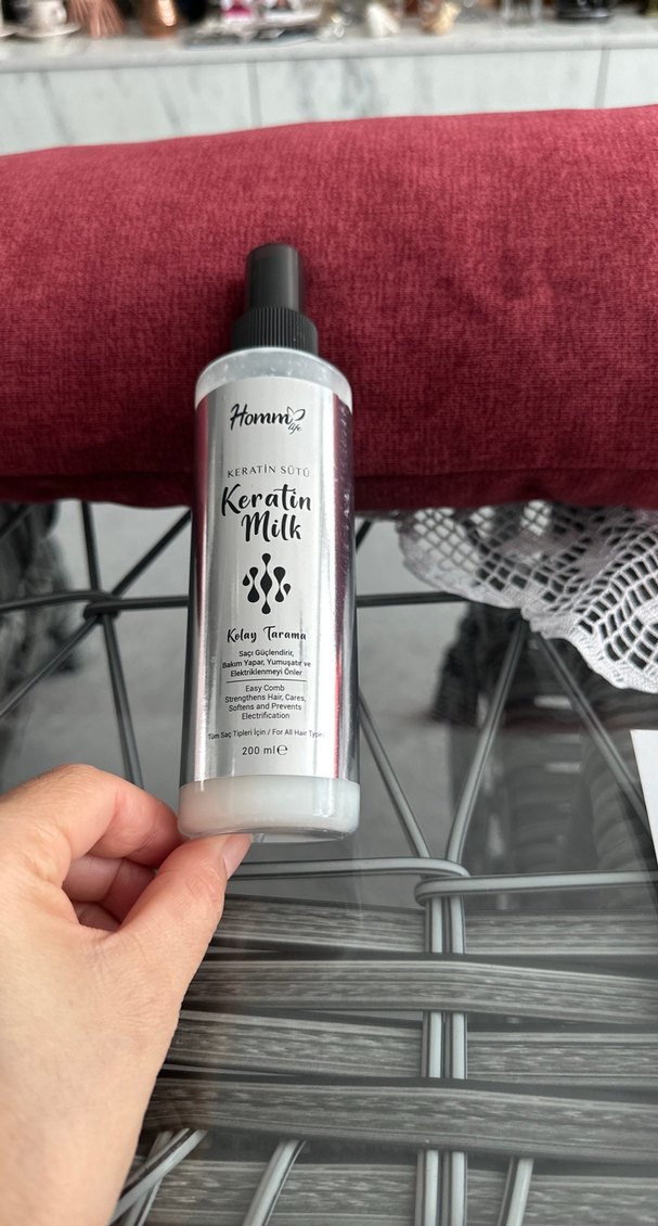 Homm Life markasına ait 200 ml Keratin Milk, keratin ve süt proteinleriyle saçları güçlendirir, onarır ve besler. Saç dokusunu iyileştirir.