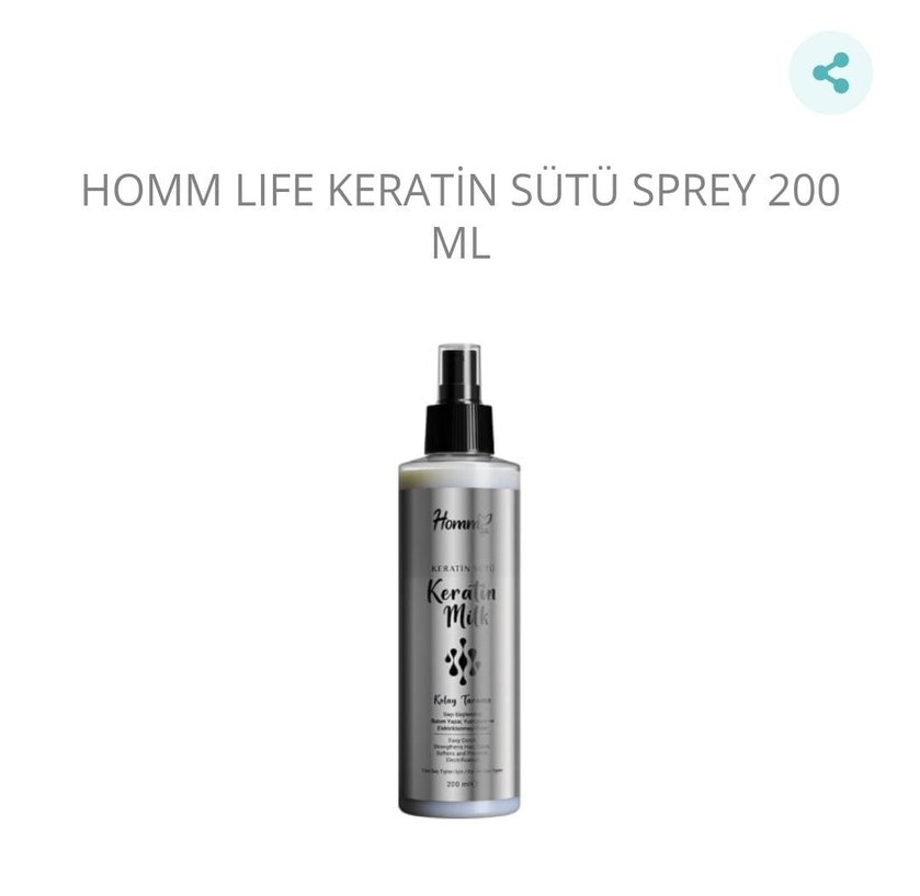 (Katalog fiyati 327 tl indirimli fiyati 200 tldir )Homm Life Keratin Sütü Sprey, keratin ile saçları besler ve korur. Saç sağlığı ve parlaklığını destekler. 200 ml şişede sunulur.