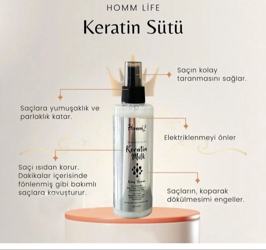 HOMM LiFE Keratin Sütü saç spreyi, saçın kolay taranmasını sağlar, elektriklenmeyi önler, saçı korur ve kopma ile dökülmeyi engeller. Saça yumuşaklık ve parlaklık katar.