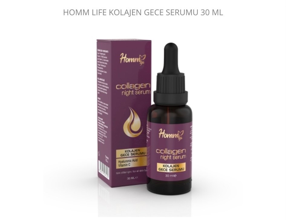 Homm Life kolajen gece serumu, hyaluronik asit ve C vitamini içerir. Tüm cilt tipleri için uygun, cildi gece boyunca nemlendirir ve sıkılaştırır.