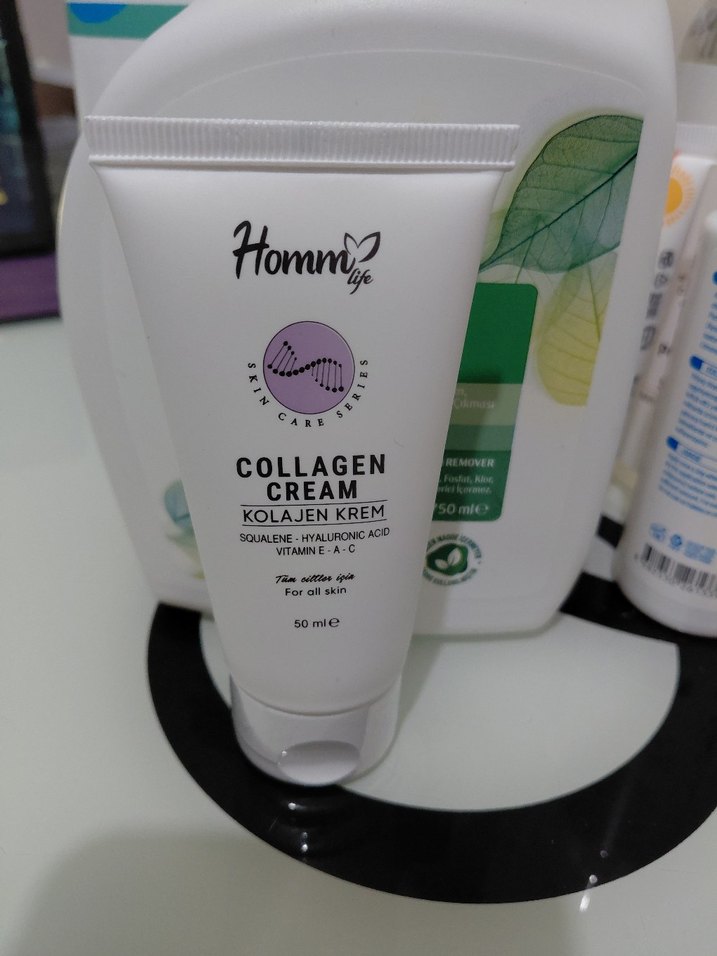 Homm Life Kolajen Krem, skualen, hyaluronik asit ve E, A, C vitaminleri içerir. Tüm cilt tipleri için nemlendirici ve besleyicidir.