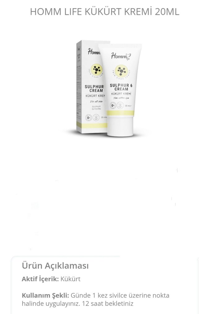 Homm Life Kükürt Kremi, aktif kükürt içerir ve sivilce üzerine günde bir kez nokta uygulaması için uygundur.