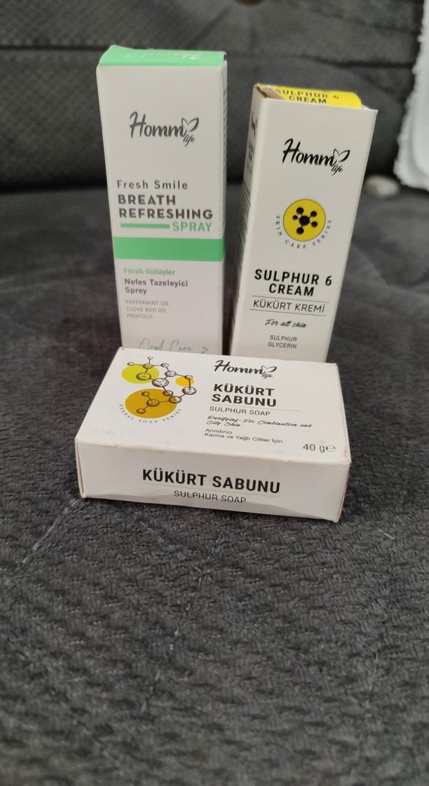 Homm Life kükürt sabunu, kremi ve nane kokulu nefes tazeleyici spreyi içerir.