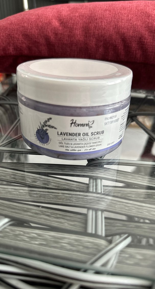 Homm Life İnce tuz ve lavanta çiçeği özü içeren lavanta yağlı peeling, cildi nazikçe eksfoliye eder ve nemlendirir.