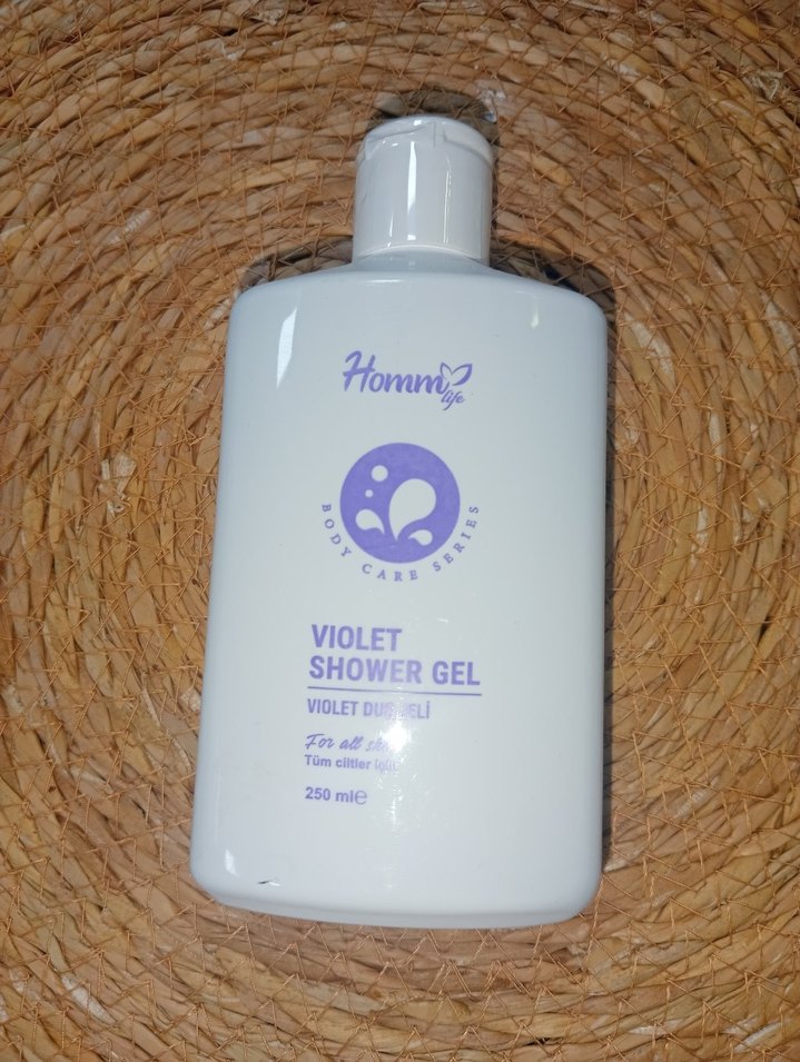 Homm Life markasının 250ml menekşe kokulu duş jeli, tüm cilt tipleri için uygundur ve cildi nazikçe temizler.