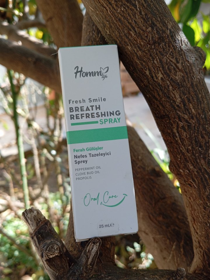 Homm Life Nefes Tazeleyici Sprey, nane yağı, karanfil yağı ve propolis içerir. Ferah bir nefes sağlar. 25 ml.
